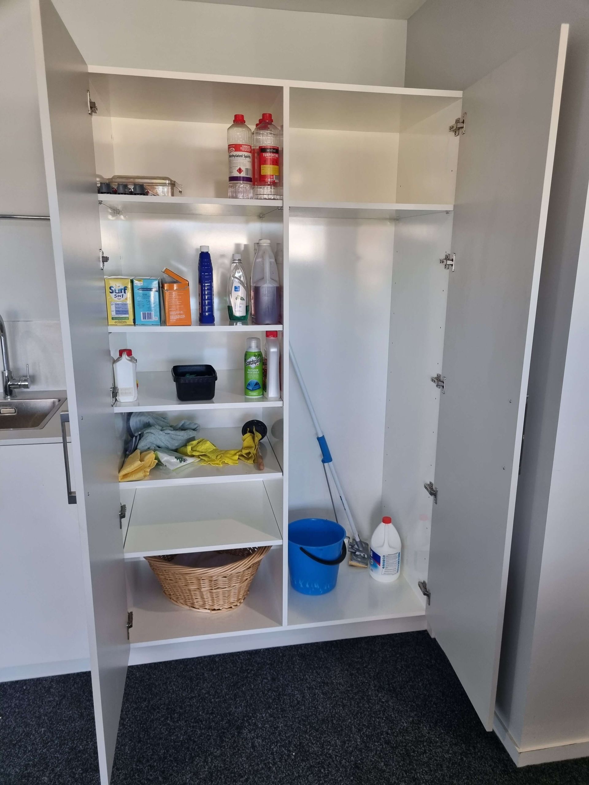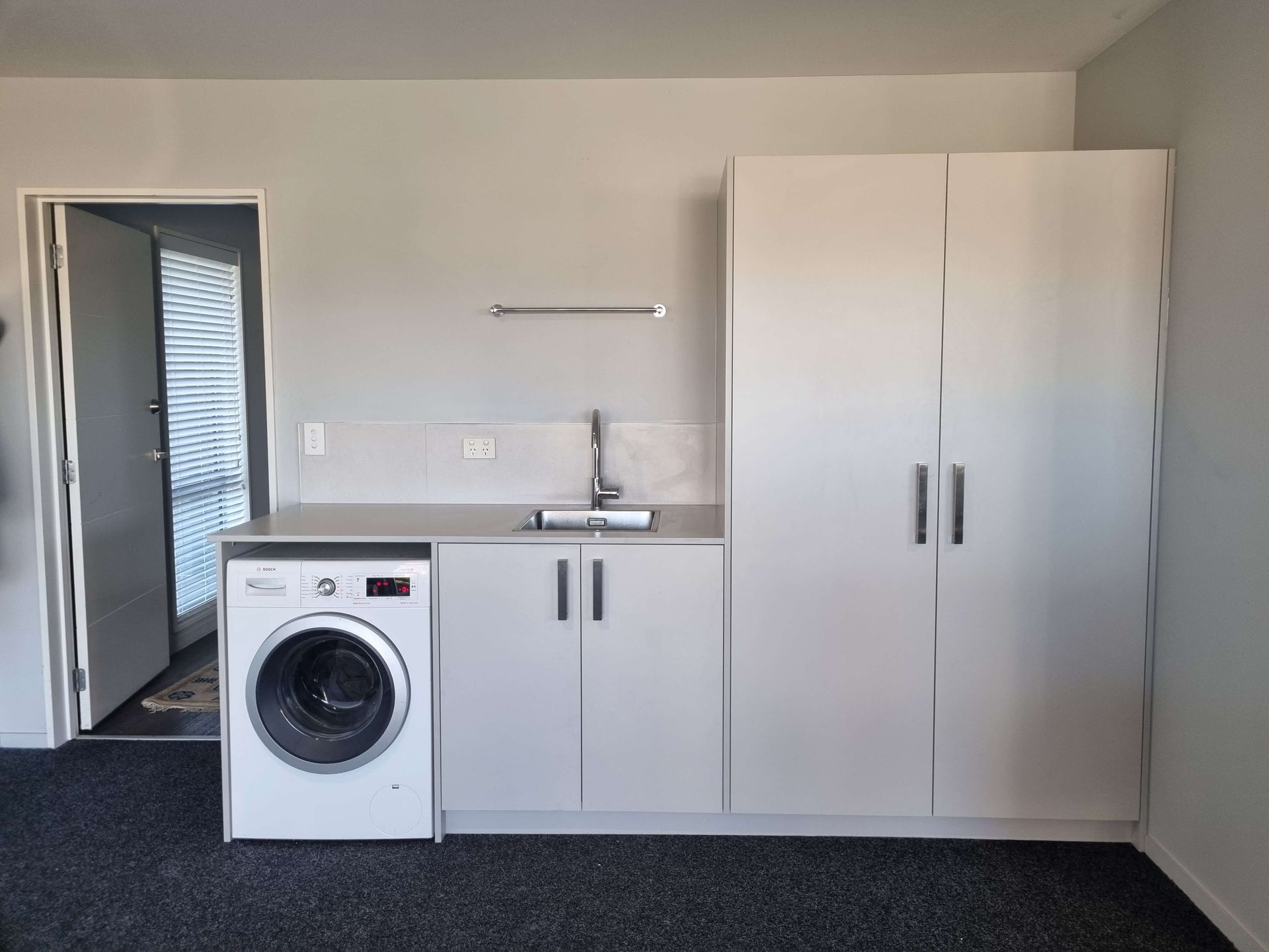 A tired laundry inside an attached garage in West Melton needed a full reset to boost storage and improve usability. The brief: replace all joinery, integrate the washing machine, and deliver a splashback for wall